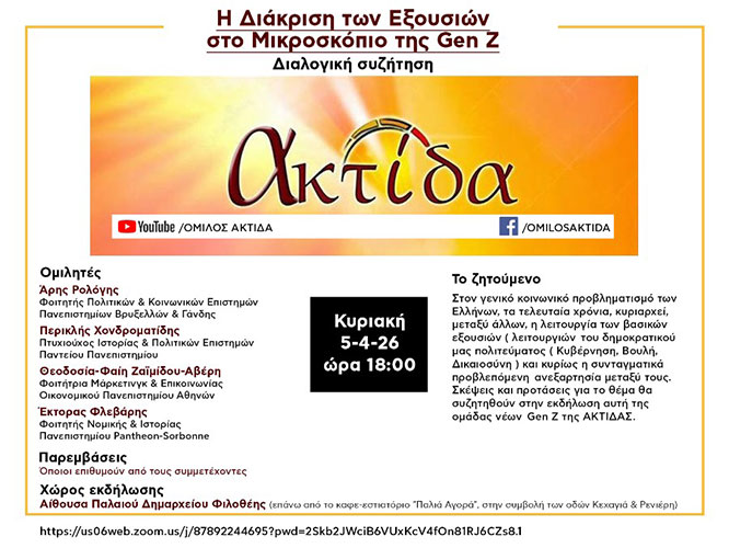 Ο Όμιλος ΑΚΤΙΔΑ ανοίγει τον δημόσιο διάλογο για ένα από τα πιο κρίσιμα ζητήματα της δημοκρατίας, δίνοντας τον λόγο στη νέα γενιά. Την Κυριακή 5 Απριλίου 2026, στις 18:00, στη Φιλοθέη Αττικής, θα πραγματοποιηθεί εκδήλωση–διαλογική συζήτηση με θέμα «Η Διάκριση των Εξουσιών στο Μικροσκόπιο της Gen Z».